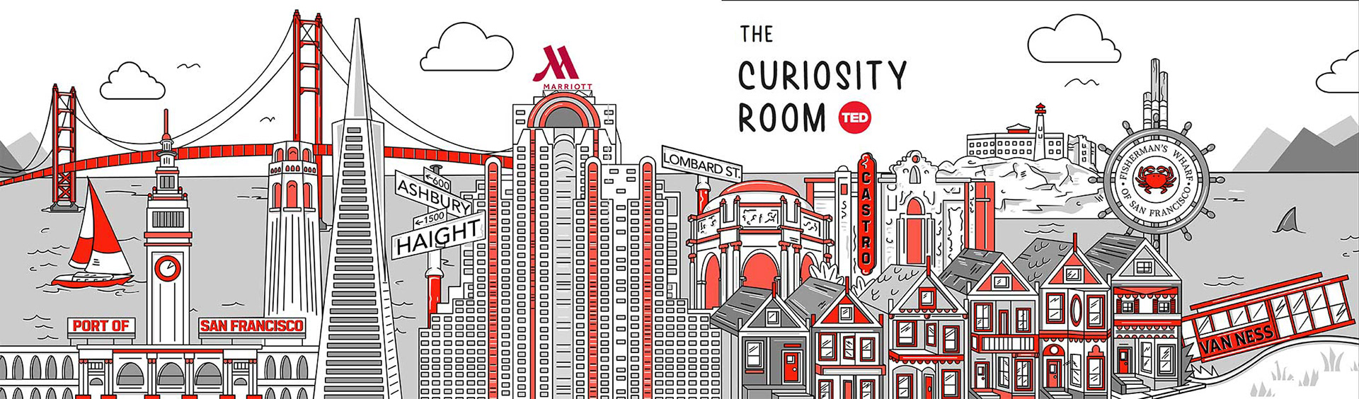 I was asked to create a series of murals for Marriott hotel rooms in San Francisco, Bangkok and London. The project was in conjunction with TED Talks who designed puzzles that would interact with the murals to unlock surprises around the room. I also illustrated pillows and door hangers for the project.