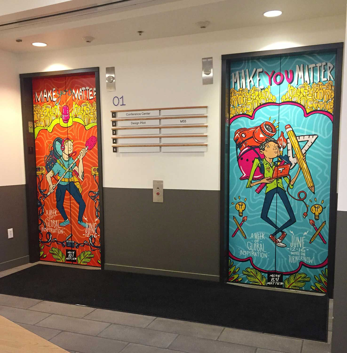 The In-House team at Turner Broadcasting asked me to come up with a look for their annual Make You Matter event that takes place in their 80 offices around the world. Their only requirements were bright colors, somewhat tropical, including tools of their trade and showcasing innovation. After showing the sketches for the first poster, they liked it so much that they asked for two more.